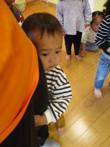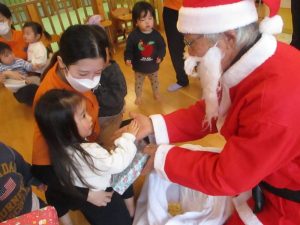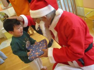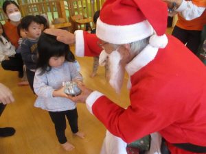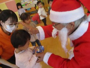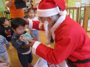 まだサンタさんの存在に慣れていない子どもたちは涙が出たり保育者の陰に隠れたり・・![]()