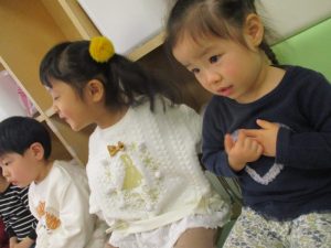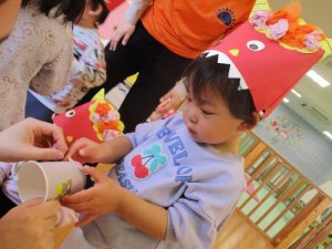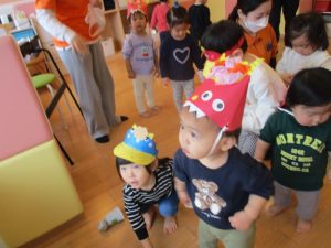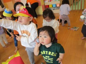 この日まで鬼のお面を作ったり、絵本を見たり『まめまき』や『おにのパンツ』のうたを歌ったりしながら期待を膨らませていた子どもたち![]()