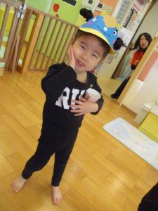 早速自分で作った鬼の帽子を被り、変身![]()