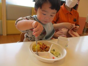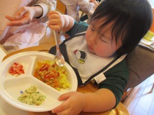 『おに』と聞いてちょっと不安そうにしていた子どもも、にっこり笑う鬼を見てホッとしたのか、モリモリ食べていました![]()