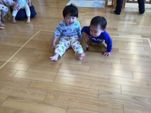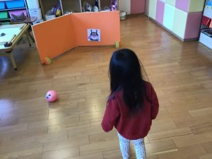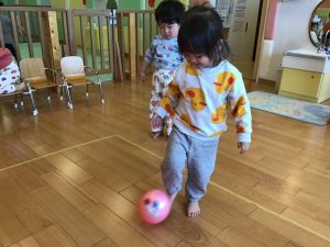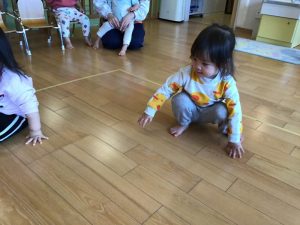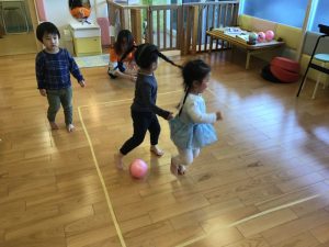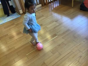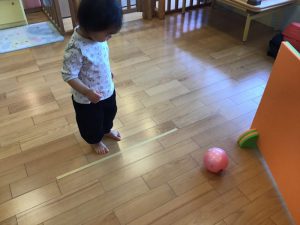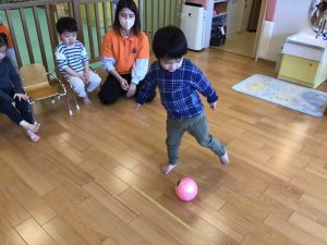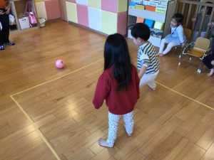 保育者が転がしたボールに当たらないよう、線の中を逃げます![]()
