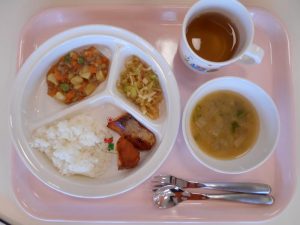 ご飯・味噌汁・魚の竜田揚げ・ひじきの炒り煮・粉ふき芋・バナナ