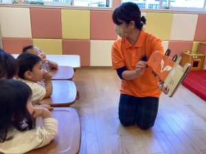 おはなし、おはなし、パチパチパチパチ・・・・」と手遊びが始まると絵本の読み聞かせが始まります。