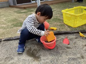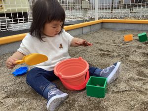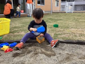 砂場では、スコップを使って、型抜き遊びや砂の移し替えを楽しんでいるところです?