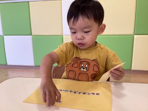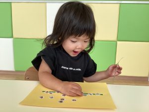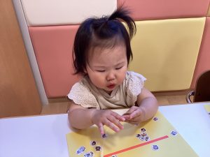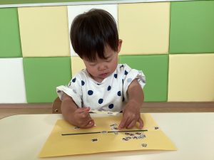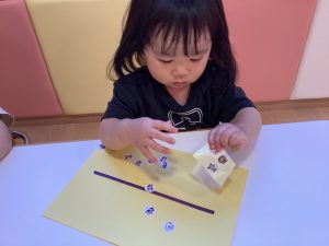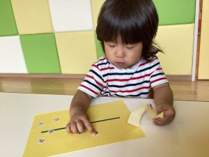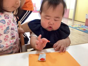 上手に指先でシールをつまんでいますね✨