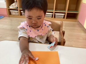 ペタペタとくっつくシールに興味津々