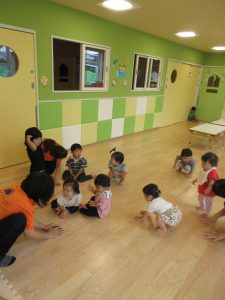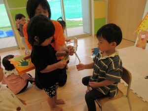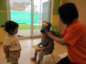 保育者の「だるまさんが」のペープサートでは、「だ・る・ま・さ・ん・が」の声に合わせてリズムをとりながら、ビ