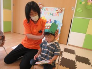 誕生カードをお友だちからもらい、そして「ハッピーバースデー?」の歌でお祝いをしてもらい、保育者手作りの王冠?を被せてもらい、気分は王様