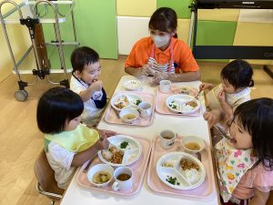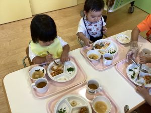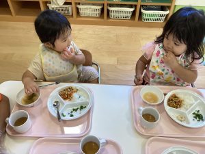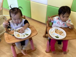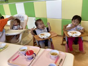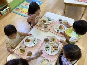 保護者の方から「最近少しずつ食べられる食材が増えてきたような気がします」「家でなかなかできないスプーンやフォーク、コップの練習ありがとうございます」と、嬉しいお便りをいただきました。私たち保育者も楽しく食べられるように、一人一人の様子を見ながら関わっていきたいと思います。