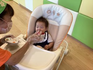 いちばん小さいお友達も、離乳食を大きなお口を開けてモグモグ・・・一生懸命食べています。