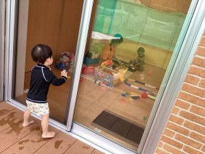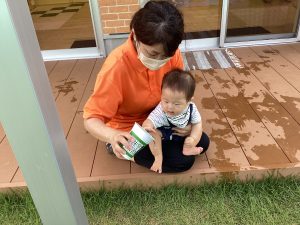 6ヶ月のお友だちは、テラスで少しだけ水に触れてみたり