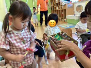 朝夕涼しくなり、秋の気候になってきましたね🍁園庭の芝生もふわふわになり、隙間からバッタが顔を覗かせています🦗