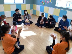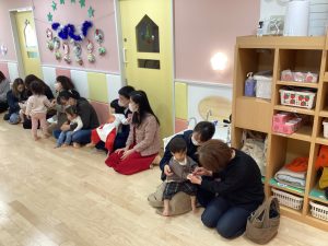もも組🍑は歌を歌う時も、子ども達と触れ合いながらアカペラなので、保護者の方々にもアカペラで参加していただきました💕