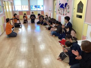 参加人数や、発表する内容により、もも組(0歳児)🍑といちご組•りんご組(1•2歳児)🍓🍎に分かれての発表会になりました。