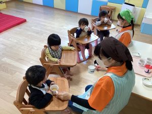 この時期「自分で」という気持ちが芽生える時期です。そんな気持ちを大切に自分でできた嬉しさや満足感が味わえるように関わっています。