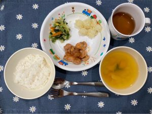ごはん 味噌汁(玉ねぎ・かぼちゃ) チキンチャップ 野菜炒め 粉ふき芋(カレー味)