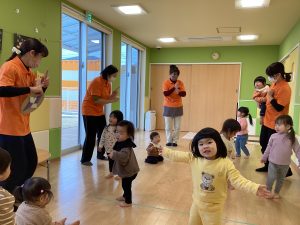 1、2歳児さんはもちろん、まだ歩けない0歳児さんも、みんなの楽しんでいる様子を見て、身体を揺らしたり、手を叩いたりしながら、雰囲気を楽しんでいます![]()