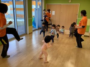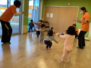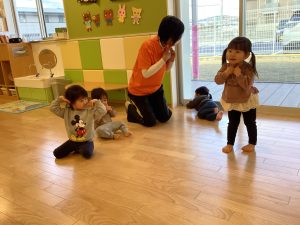 次に、「Stand up、sit-down」の音楽に合わせて身体を動かします