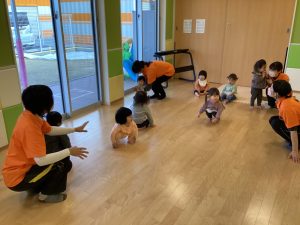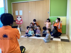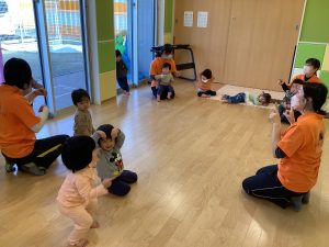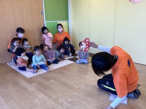 みんなが集まると、大好きな「だるまさんが」のペープサートに注目❣️