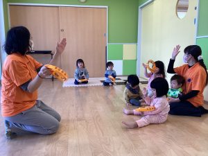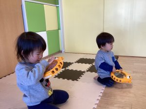 続いては楽器遊び。今月は大きなたいこ、小さなたいこの歌に合わせて、タンバリンを鳴らしています