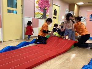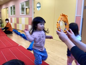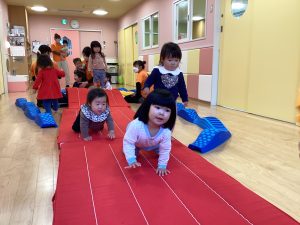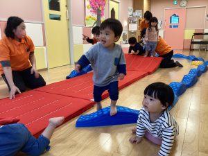 いちご組さんはサーキット遊びが初めてのお友だちもいましたが保育者に手伝ってもらいながら坂を一生懸命よじ登ったり、手を繋いでデコボコの上を上手に歩くことができましたよ![]()