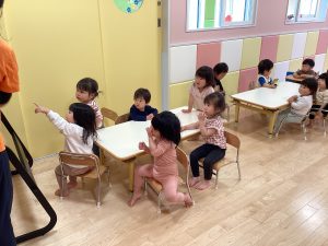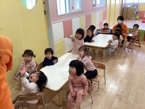 繰り返しよんでいると、登場する動物の髪型や、服装にも目を向ける子どもたちが出てきました。最近ではイヌのサブちゃんの足の爪がギザギザな事に気づき、「わんわん、爪切ってないねー!」との声![]()