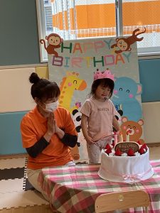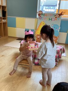 ピンク色の手作り冠で可愛らしくオシャレしたら、お友だちから歌のプレゼント🎁保育者からは、手作りカードのプレゼント🎁を受け取りました