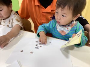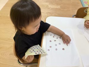 動物のシールだったので知っている動物のシールを貼る時には「わんわん!」「にゃー」と声に出しながら貼る姿も見られました