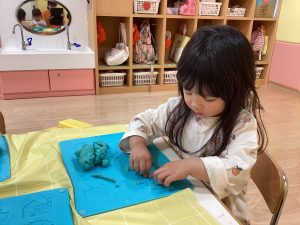 粘土が配られると粘土板を使ってチューリップやうさぎの形を型どって遊んだり、手でくるくる丸めてアイスやケーキを上手に作ったりする子どももいましたよ