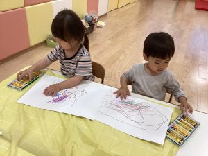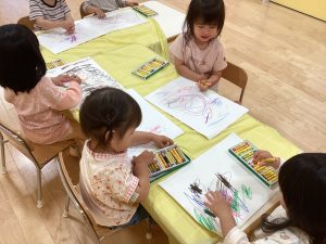 1人一箱のクレヨンを渡してもらうと嬉しそうな表情が見られ「描いても良い〜?」と好きな色を手に取ると「みて〜ピンク」「今度はブルー」などお友だちや保育者とおしゃべりしながら、画用紙いっぱいに思い思いの絵を描いていましたよ