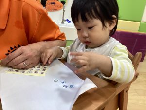 保育者と一緒にシールを台紙からとると指先を上手に使ってペタペタとシールを貼ることができました