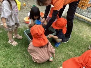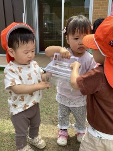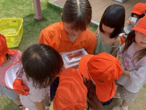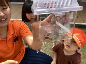 ピョンピョンと跳ねるカエルは少し怖がる子どももいましたが保育者がカエルを虫かごに入れると近くでカエルを観察し、「おおきいねー」「おなか見えたねー」とみんなで見ることができましたよ![]()