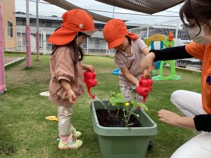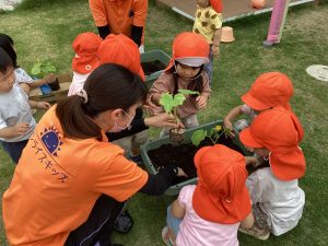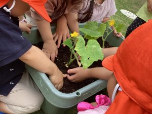 プランターときゅうりの苗が出てくると「これなにー?」「おはなー?」と興味津々な子どもたち![]()