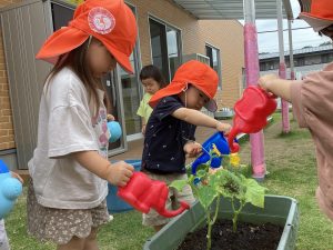 「きゅうりの下の方にそっとお水かけてあげてね」と保育者が伝えると「そーっと」と声に出しながら水やりをしてくれている姿はとてもかわいかったですよ![]()