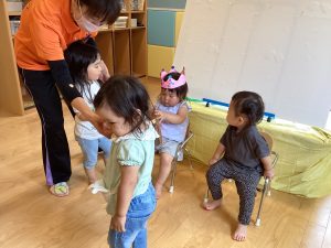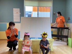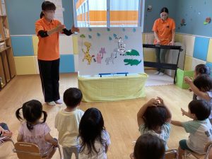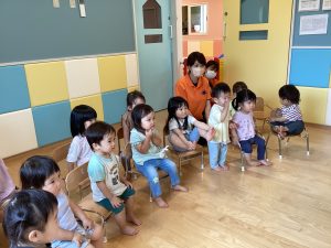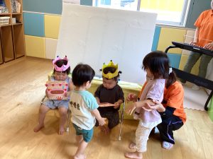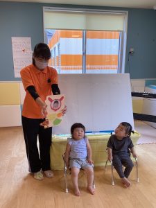 きりんさんとワニさんの傘は、少し難しかったようで「なにかな?」「かえるさんかなー?」「へびさん?」とたくさん考え、保育者にも助けてもらいながらパネルの後ろから少し顔を出したきりんやワニを見逃さず「あっ、きりんさん!」「ワニだぁー」と答えて、パネルに動物が登場すると大喜び![]()