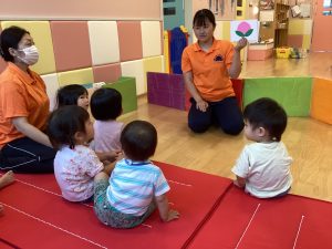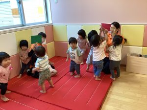 また、保育者がそれぞれにカードを持ち、子どもたちに英語で色を伝え、伝えた色を持っている先生のところへいってタッチ!