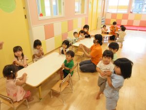 1から5までを英語に変えて数えています!保育者が数え始めると、それに合わせて指を使いながら、「ワン、ツー、スリー、フォー、ファイブ!」とゆっくりと大きな声で答えてくれます😊