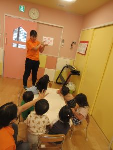 最初は、指を数えていましたが、他の身の回りのものも数えてみよう‼︎という事で、みんなが大好きなアンパンマンや魚、花の絵を使って、数えました。