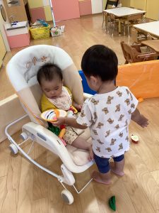 小さいクラスのお友だちのお世話もしてくれるようになったりんご組さんといちご組さんはままごとが始まるとぽぽちゃんを抱っこして「おいしい?」と声をかけながらミルクを飲ませてあげたり、「おやすみー
