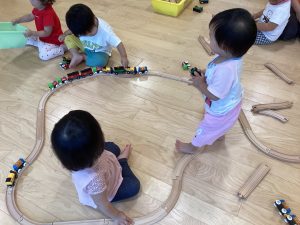 電車や車が好きな子どもたちは線路をたくさんつなげて電車を走らせて遊んでいます🚃
