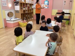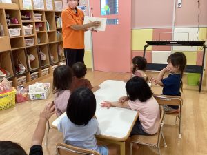 さんかく おにぎり。…と、ここまでくると、「ちょーだーい!」と手をのばしたり、絵本の絵を触りにいく子も見られます🍙