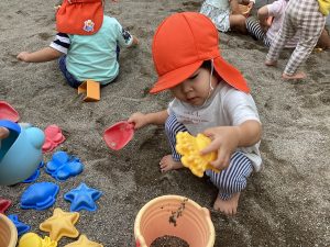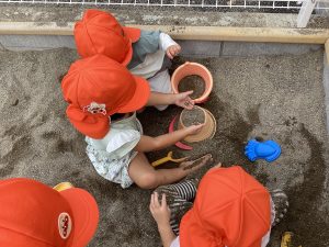 砂場ではお山を作ったり、自分の足に砂をたくさんかけて足を埋めたり、スコップですくった砂をバケツに入れて、クルッとひっくり返しケーキを作って「ハッピバースデートゥーユー」と歌ってお友だちをお祝いする姿がよく見られますよ
