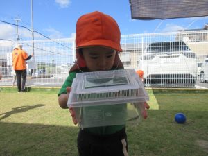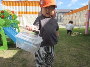 触るのが少し怖いお友だちも保育者が虫かごに入れると「みせてー!」と興味津々で見たり、触ったりして生き物と触れ合う楽しさを味わっています