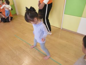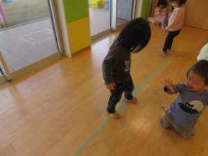 テープに横向きに立つと「グーパーグーパー」と声を出しながらカニ歩きを楽しむ子どもたちです![]()