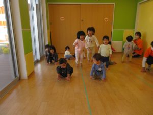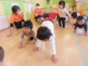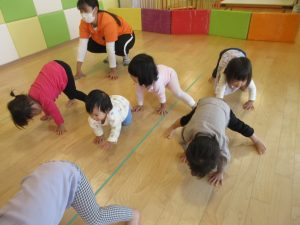 今月の体操ではハイハイやクマ歩き、カニ歩きなどいろんな動きを楽しんでいます💪