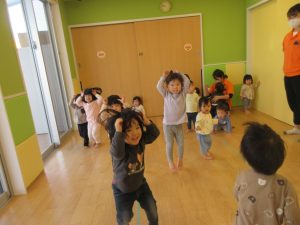 子どもたちから「うさぎさんもしよー!」「カエルさんもしたい!」とリクエストの声が上がるのでカエルになりきりカエルジャンプをしたり、ぴょんぴょんジャンプをしてうさぎになりきって楽しむこともあります![]()