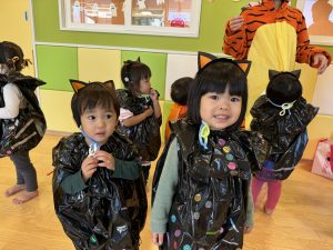 ハロウィンについてのお話を聞いた後、自分たちでシールを貼ったり、マーカーで絵を描いたりして作った衣装でジャックオーランタンや黒猫に変身してハロウィン会がスタート![]()