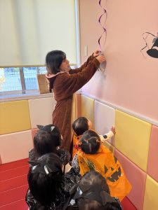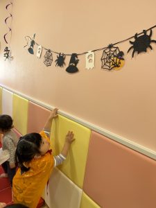見つけると「おばけおるよ!」「キャンディ見つけた!」「あそこにもいるよー!」など見つけられると大喜びで知らせてくれ、保育室のハロウィン飾りを楽しみました👻