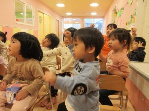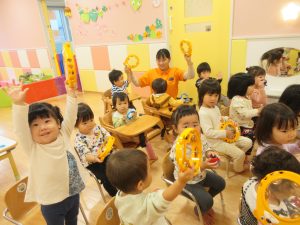最初は上手くリズムを取るのが難しかった子ども達ですが、保育者と一緒にアンパンマンのキャラクターを見ながら、手を叩いたり、楽器を鳴らすことで、楽しくリズムが取れるようになりました![]()