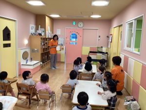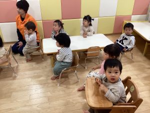 最後はなめこが鬼ごっこ。なめこ汁になると、「ふーふー」「ちゅるん」と食べ真似で美味しくいただき、皆笑顔になりました![]()
